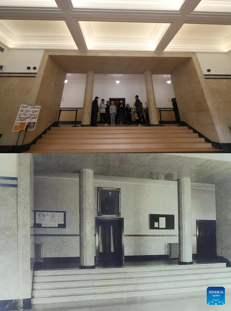This combo photo shows the lobby of the Design Innovation Institute Shanghai on March 18, 2023 (above, taken by Fang Zhe) and an undated file photo of the same place in east China's Shanghai. (Xinhua/Fang Zhe)