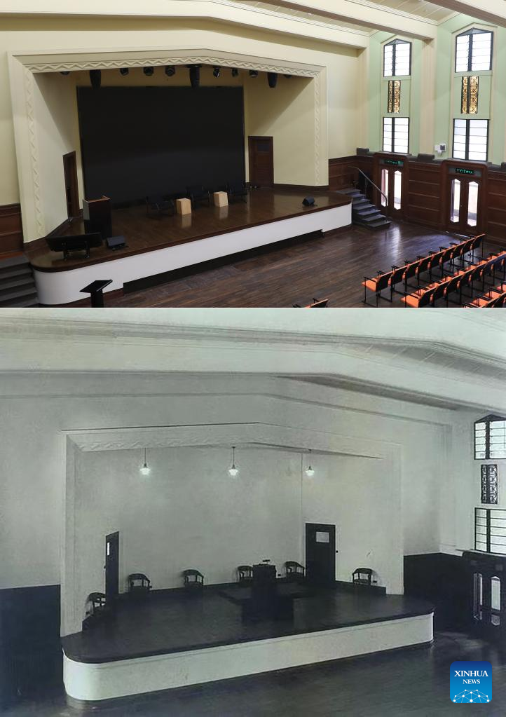 This combo photo shows an auditorium of the Design Innovation Institute Shanghai on March 16, 2023 (above, taken by Fang Zhe) and an undated file photo of the same place in east China's Shanghai. (Xinhua/Fang Zhe)