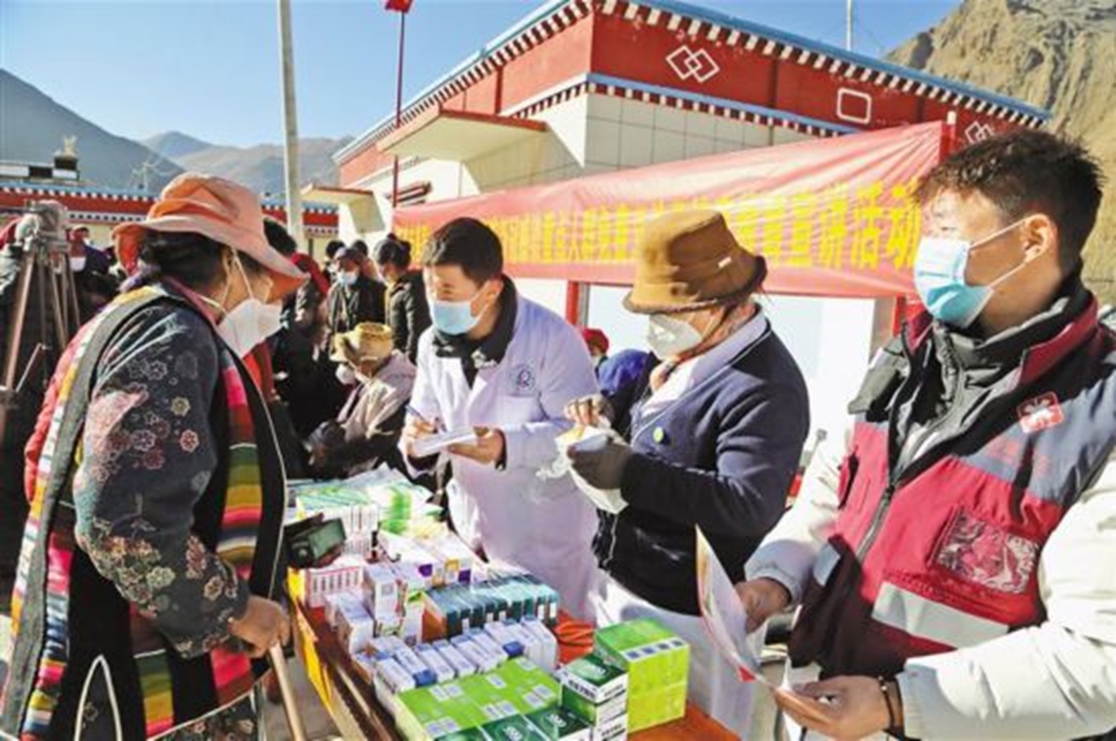 Doctors of a hospital in Qonggyai county, Shannan, southwest China's Tibet autonomous region send free drugs to residents. (Photo from Tibet Daily)