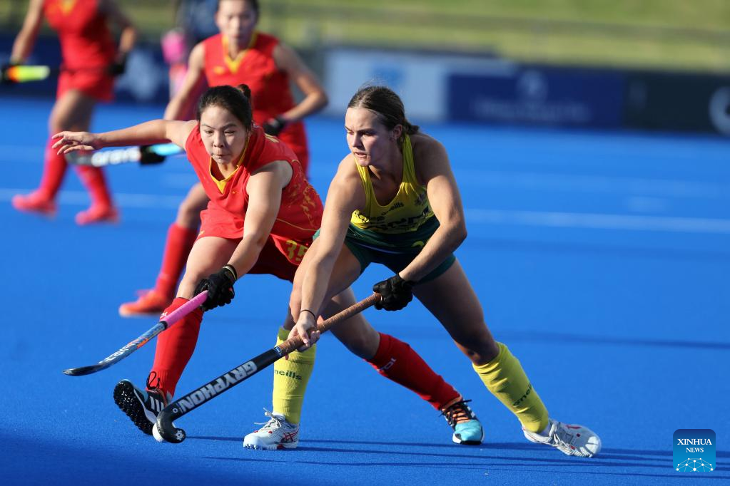 Tan Jintong (L) of China competes during a women's hockey friendly match against Australia in Perth, Australia on March 25, 2023. (Photo by Zhou Dan/Xinhua)