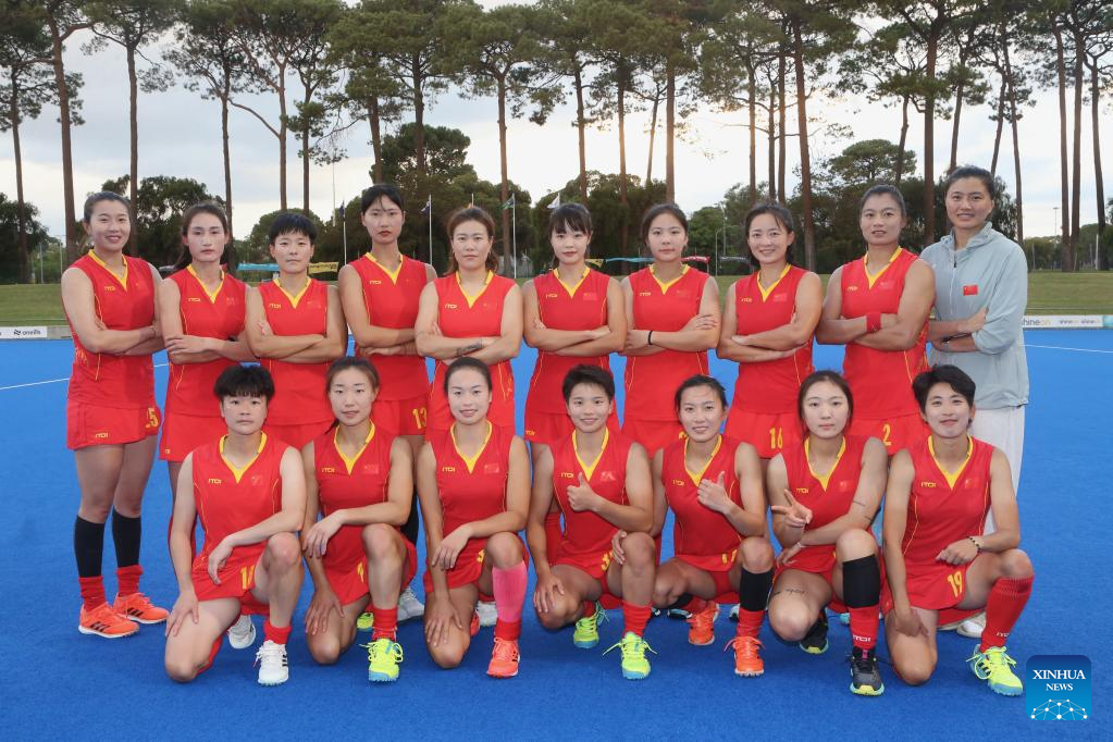 Members of China pose for group photos prior to a women's hockey friendly match against Australia in Perth, Australia on March 25, 2023. (Photo by Zhou Dan/Xinhua)