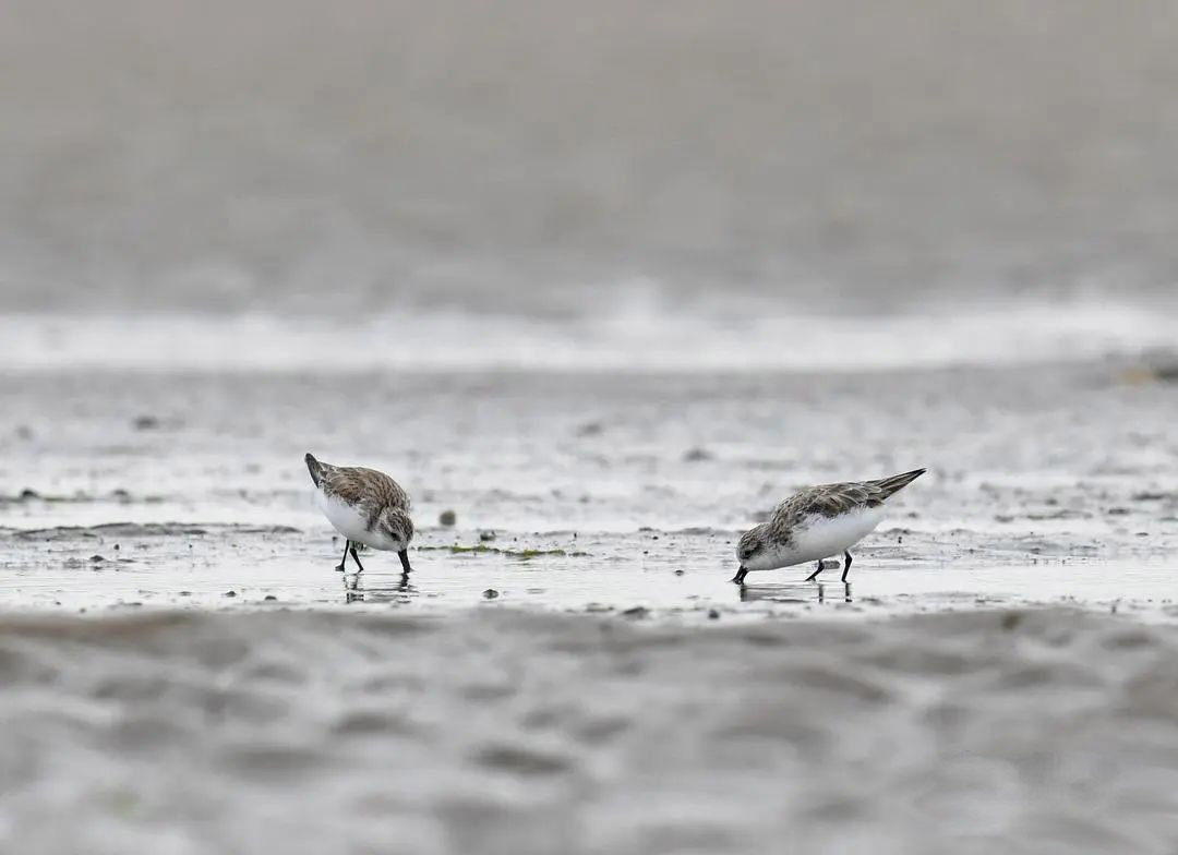 Two spoon-billed sandpipers forage in Weitou Bay, Quanzhou city, southeast China’s Fujian Province. (Photo/Chen Wensen)