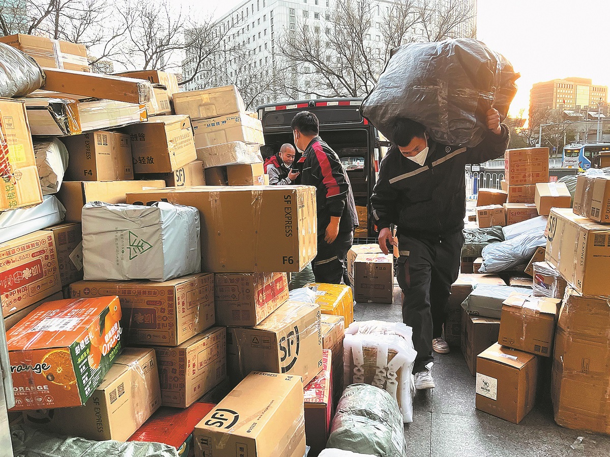 Workers sort packages at a transfer station in Beijing in January. CHINA DAILY