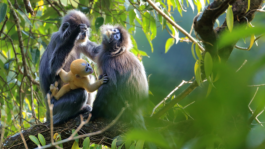Photo shows a baby Phayre's leaf monkey cuddling with its parents in the lush forest of Mangshi city, Dehong Dai and Jingpo Autonomous Prefecture, southwest China’s Yunnan Province. (Photo/Zheng Shanhe)