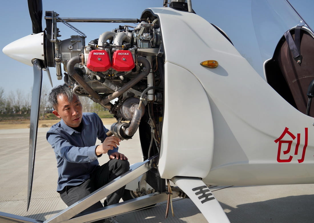 Yang Shiyi inspects a rotorcraft in Luoyang city, central China’s Henan Province, on March 14, 2023. (Photo/Xinhua)