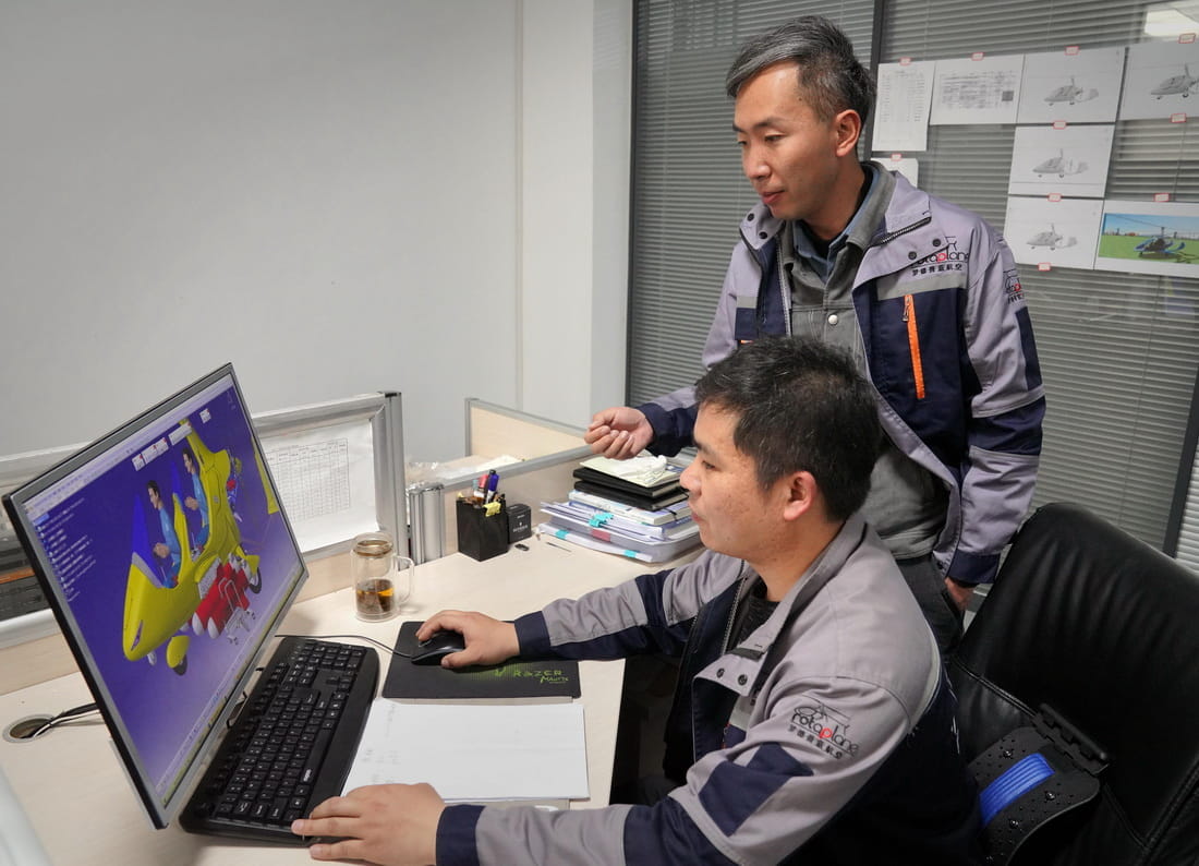 Yang Shiyi instructs his employee about the rotorcraft’s design in Luoyang city, central China’s Henan Province, on March 14, 2023. (Photo/Xinhua)