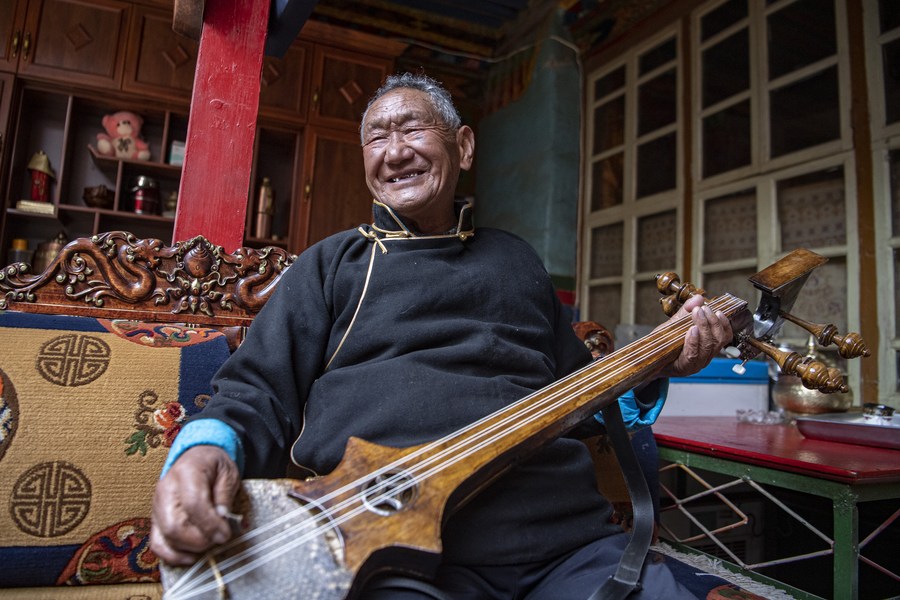 Norbu Tsering plays the Zhanian musical instrument at home in Gyangze County in Xigaze, southwest China's Tibet Autonomous Region, March 20, 2023. (Xinhua/Sun Fei)