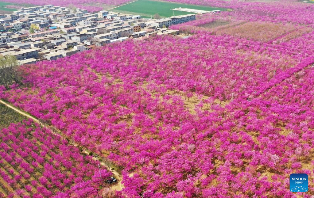 This aerial photo shows the redbud flower fields in Xiaozhao Township of Jian'an District, Xuchang City, central China's Henan Province, March 27, 2023. Recently, about 200 mu (around 13.33 hectares) of redbud trees in Xiaozhao Township entered full bloom, attracting many tourists to enjoy the flowers. (Xinhua/Niu Shupei)