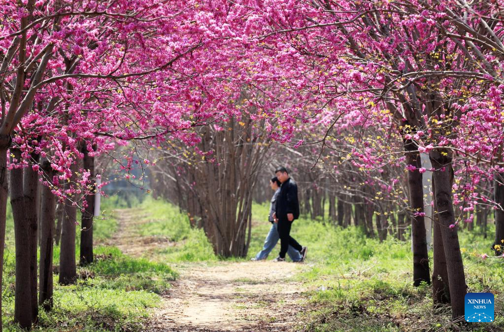 Tourists visit the redbud flower fields in Xiaozhao Township of Jian'an District, Xuchang City, central China's Henan Province, March 27, 2023. Recently, about 200 mu (around 13.33 hectares) of redbud trees in Xiaozhao Township entered full bloom, attracting many tourists to enjoy the flowers. (Xinhua/Niu Shupei)