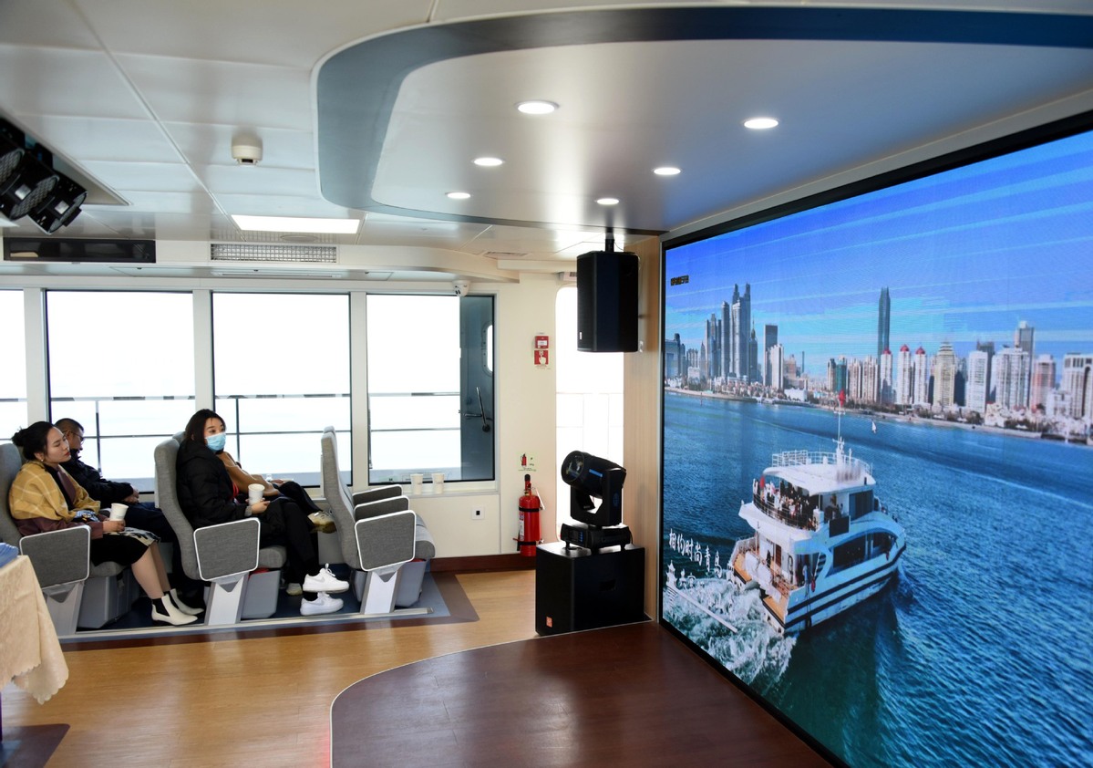Tourists watch a promotion video of Qingdao tourism on a cruise ship on March 27, 2023. [Photo/Xinhua]