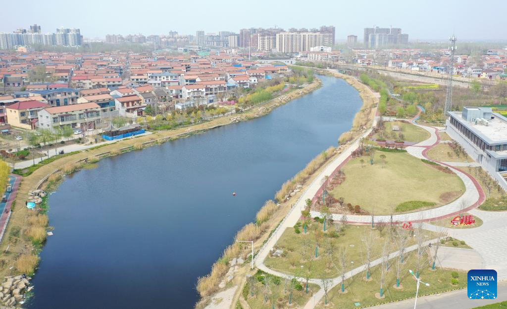 This aerial photo taken on March 28, 2023 shows a park near the Limin river in Suixian County of Shangqiu, central China's Henan Province. The No. 3 sewage treatment plant of Suixian County, completed in 2018, is a new concept sewage treatment facility combining wastewater treatment, biomass power generation, scientific research, science popularization, and eco-agriculture demonstration functions. The high-standard recycled water processed by the plant has improved the water quality of the local Limin river. (Xinhua/Zhang Haoran)