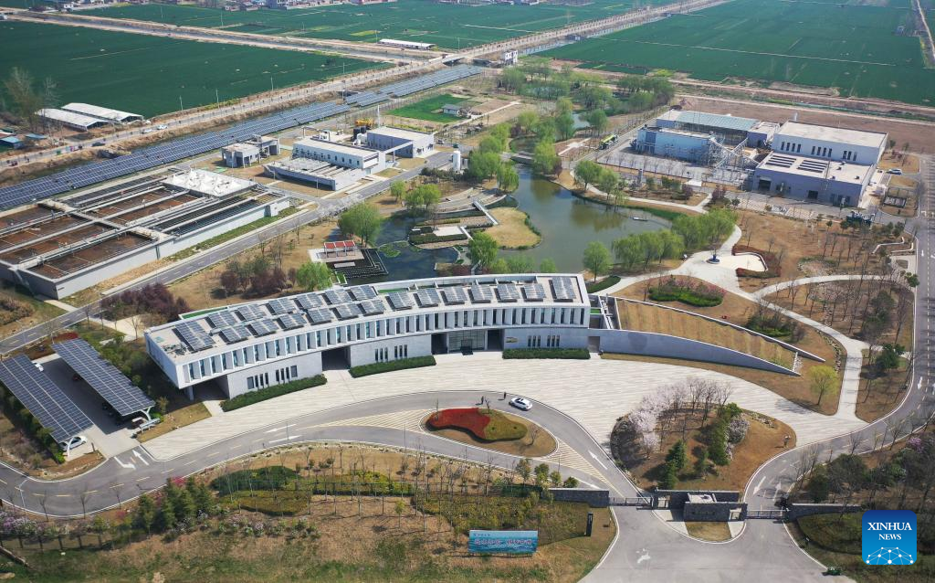 This aerial photo taken on March 28, 2023 shows the No. 3 sewage treatment plant in Suixian County of Shangqiu, central China's Henan Province. The No. 3 sewage treatment plant of Suixian County, completed in 2018, is a new concept sewage treatment facility combining wastewater treatment, biomass power generation, scientific research, science popularization, and eco-agriculture demonstration functions. The high-standard recycled water processed by the plant has improved the water quality of the local Limin river. (Xinhua/Zhang Haoran)