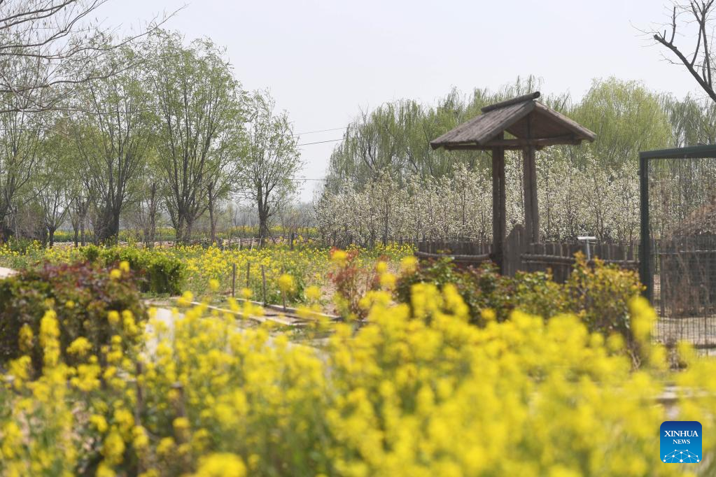 This photo taken on March 28, 2023 shows the eco-agriculture demonstration area of the No. 3 sewage treatment plant in Suixian County of Shangqiu, central China's Henan Province. The No. 3 sewage treatment plant of Suixian County, completed in 2018, is a new concept sewage treatment facility combining wastewater treatment, biomass power generation, scientific research, science popularization, and eco-agriculture demonstration functions. The high-standard recycled water processed by the plant has improved the water quality of the local Limin river. (Xinhua/Zhang Haoran)