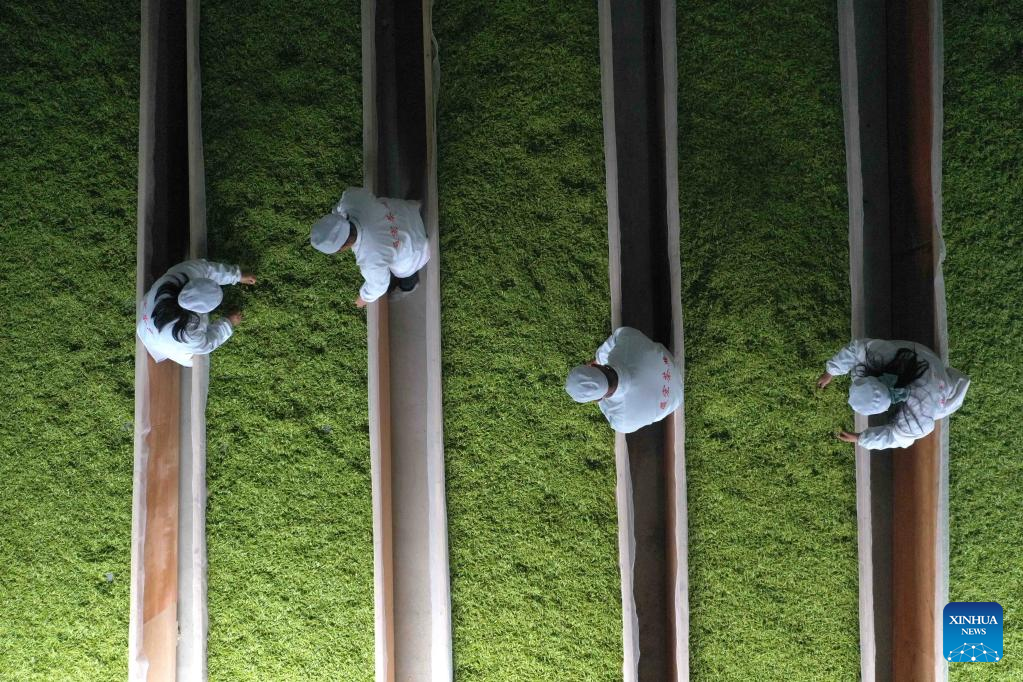 This aerial photo shows workers airing tea leaves at a tea processing factory in Dangzhen Village, Tongzhou Town of Pingtang County, southwest China's Guizhou Province, March 28, 2023. Recently, workers are busy in harvesting and processing tea leaves ahead of the Qingming Festival to produce the Mingqian (literally "pre-Qingming") tea, which are made of the very first tea sprouts in spring and considered to be of high quality. (Xinhua/Xiao Wei)