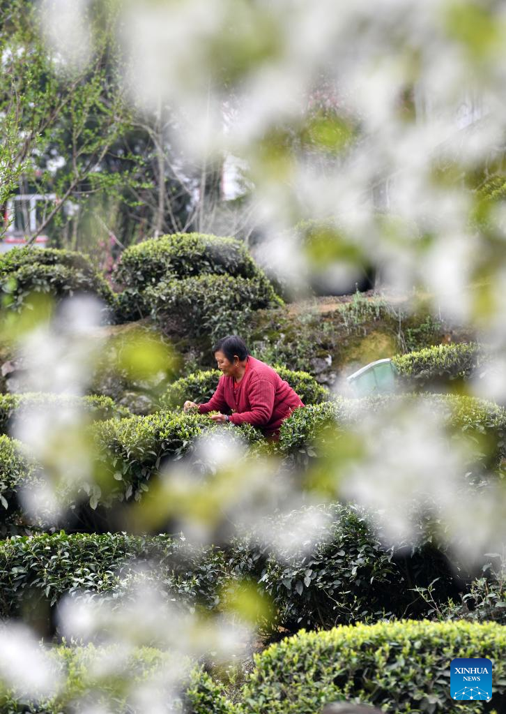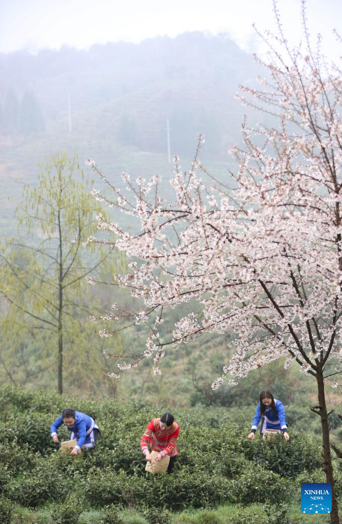 Workers harvest tea leaves in Baicha Village of Tuanba Town in Dazhu County, Dazhou, southwest China's Sichuan Province, March 28, 2023. Recently, workers are busy in harvesting and processing tea leaves ahead of the Qingming Festival to produce the Mingqian (literally "pre-Qingming") tea, which are made of the very first tea sprouts in spring and considered to be of high quality. (Xinhua/Deng Liangkui)