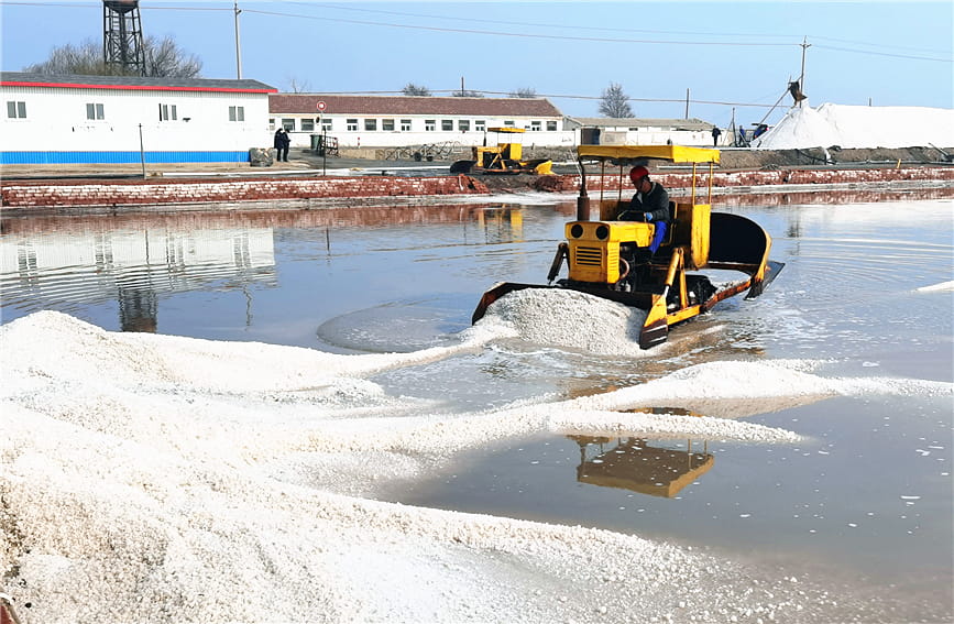 Photo shows machines working on the Changlu Hangu salt field in north China’s Tianjin Municipality. (Photo/Ge Rongyi)