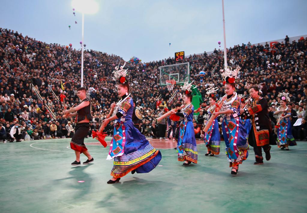 Artists dance prior to a basketball game between Team Tongren and Team Qiandongnan held in Taipan Village, Taijiang County, southwest China's Guizhou Province on March 25, 2023. (Xinhua/Liu Xu)