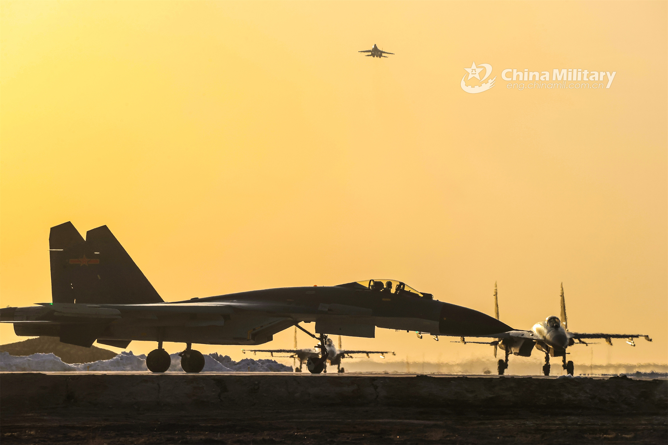 Fighter jets attached to a brigade of the PLA Air Force Xi'an Flying College taxi on the runway to get ready for a real-combat flight training exercise in mid-March, 2023. (eng.chinamil.com.cn/Photo by Cui Baoliang)