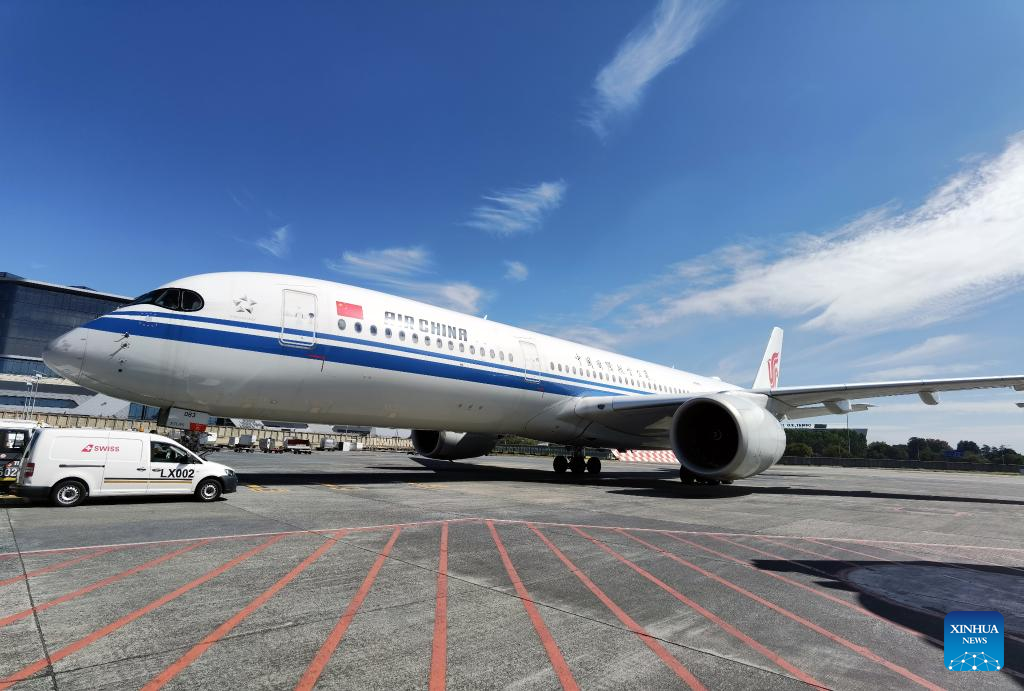 Photo taken on March 29, 2023 shows an Air China airplane carrying tourists from China landing at the OR Tambo International Airport in Johannesburg, South Africa. South Africa's tourism authority on Wednesday welcomed the first group of tourists from China since the outbreak of COVID-19. (Xinhua)