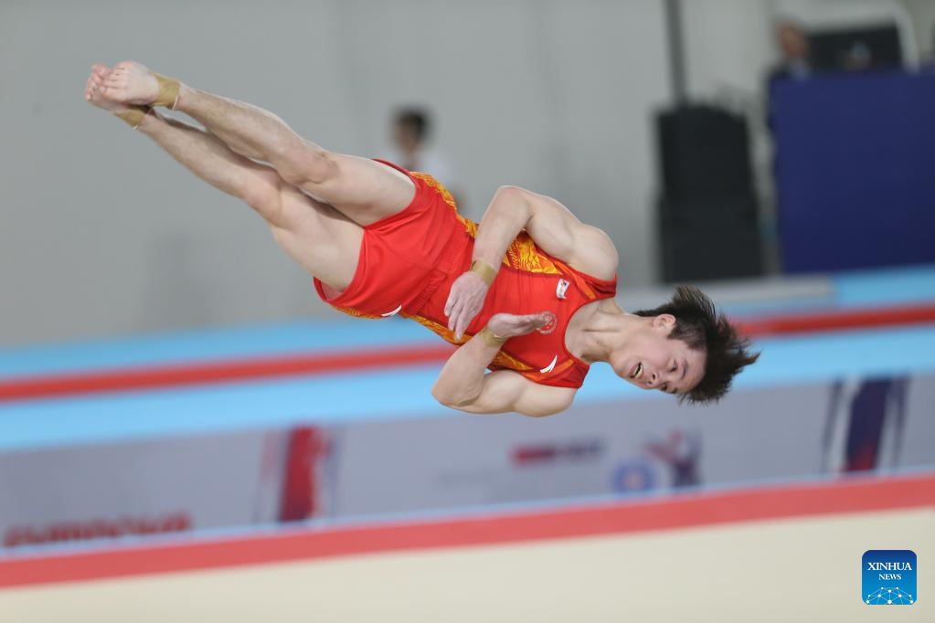 Qin Guohuan of China competes in the floor exercise competition of the men's team event at the 2nd Artistic Gymnastics Junior World Championships in Antalya, Trkiye, on March 29, 2023. (Photo by Mustafa Kaya/Xinhua)