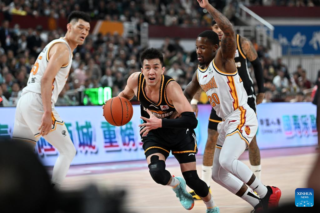 Guo Ailun (C) of Liaoning Flying Leopards vies with Kay Felder (Front R) of Shanxi Loongs during the 40th round match between Shanxi Loongs and Liaoning Flying Leopards at 2022-2023 season of the Chinese Basketball Association (CBA) league in Taiyuan, capital of north China's Shanxi Province, March 30, 2023. (Xinhua/Zhan Yan)