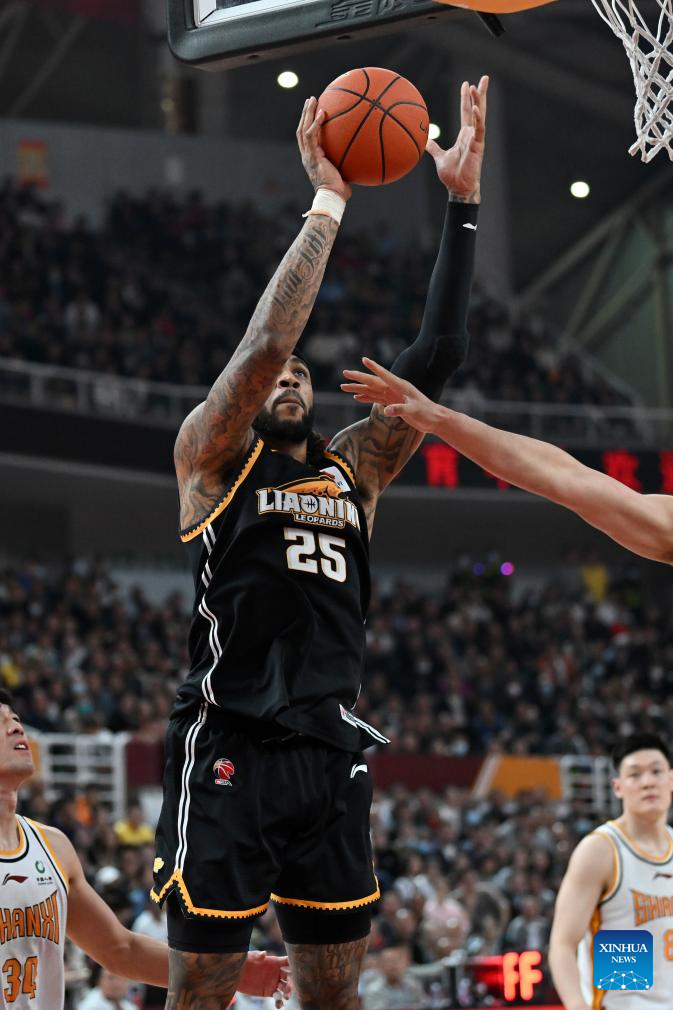 Eric Moreland of Liaoning Flying Leopards goes for a basket during the 40th round match between Shanxi Loongs and Liaoning Flying Leopards at 2022-2023 season of the Chinese Basketball Association (CBA) league in Taiyuan, capital of north China's Shanxi Province, March 30, 2023. (Xinhua/Zhan Yan)