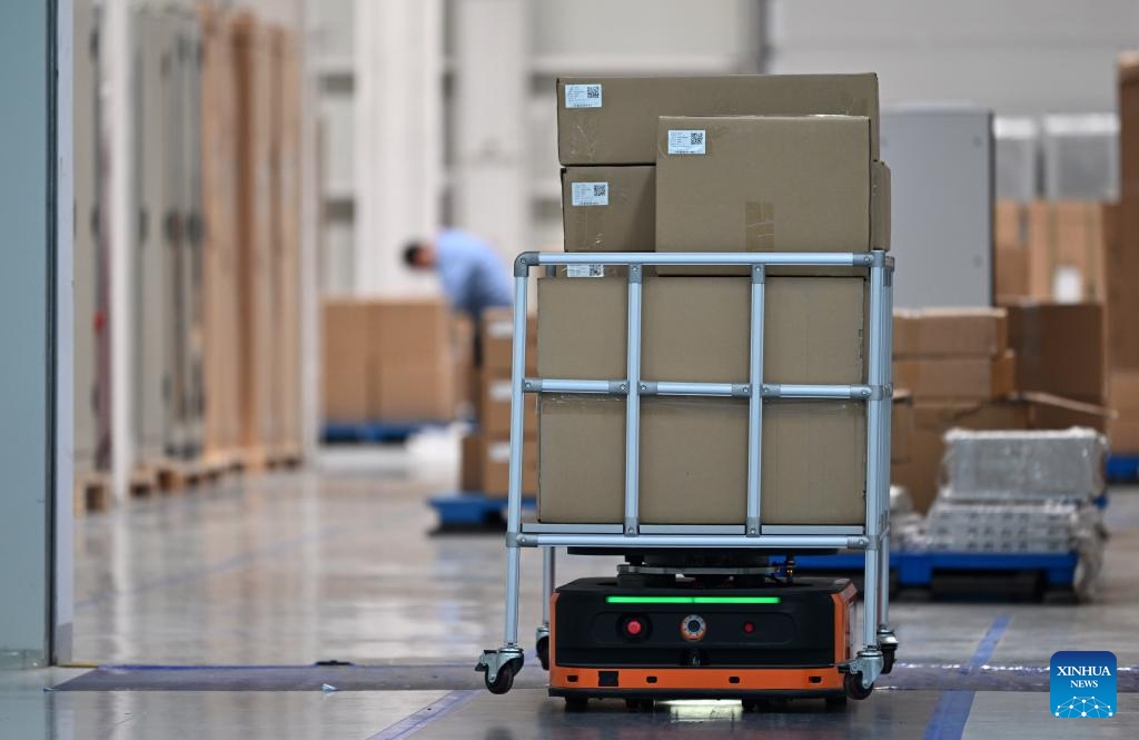 This photo taken on April 3, 2023 shows a transportation robot at a workshop of Traffic Control Technology Equipment Co., Ltd. in Wuqing District, north China's Tianjin. The Traffic Control Technology Equipment Co., Ltd. in north China's Tianjin is seeing a continuous increase in order volume this year. Inside the factory, dozens of machines are running at full capacity, and rows of circuit boards for the train operation control system are waiting to be delivered after rolling off automatic production lines.
