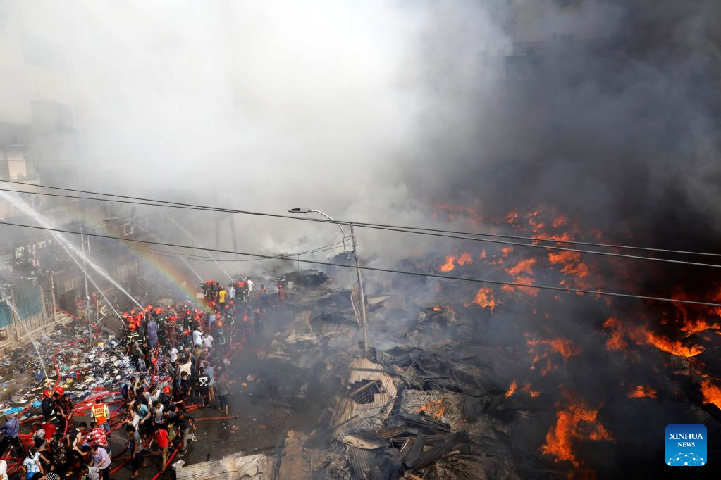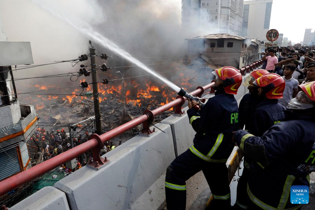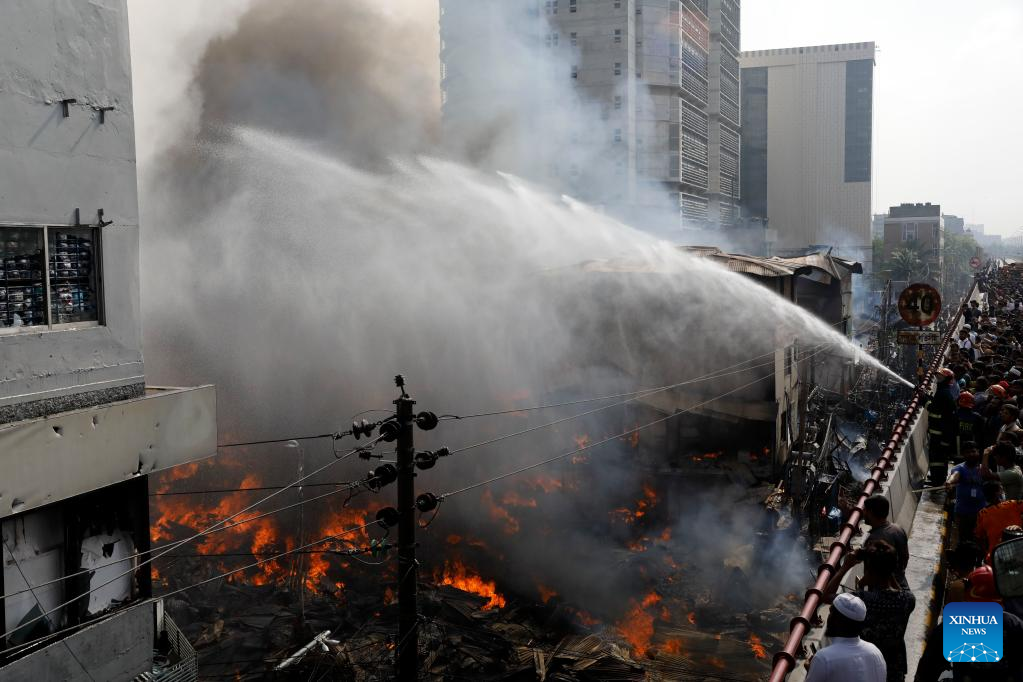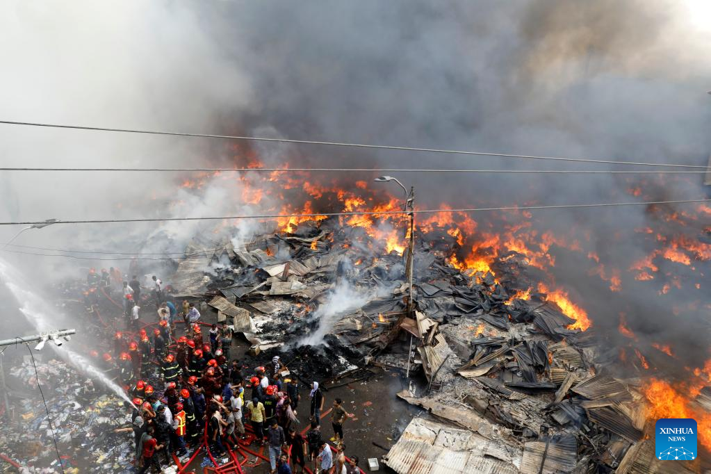 Firefighters battle a fire at a market in Dhaka, Bangladesh, on April 4, 2023. A fire gutted thousands of shops in a market in a residential neighborhood of the old part of Dhaka on Tuesday morning, destroying goods and property. (Xinhua)