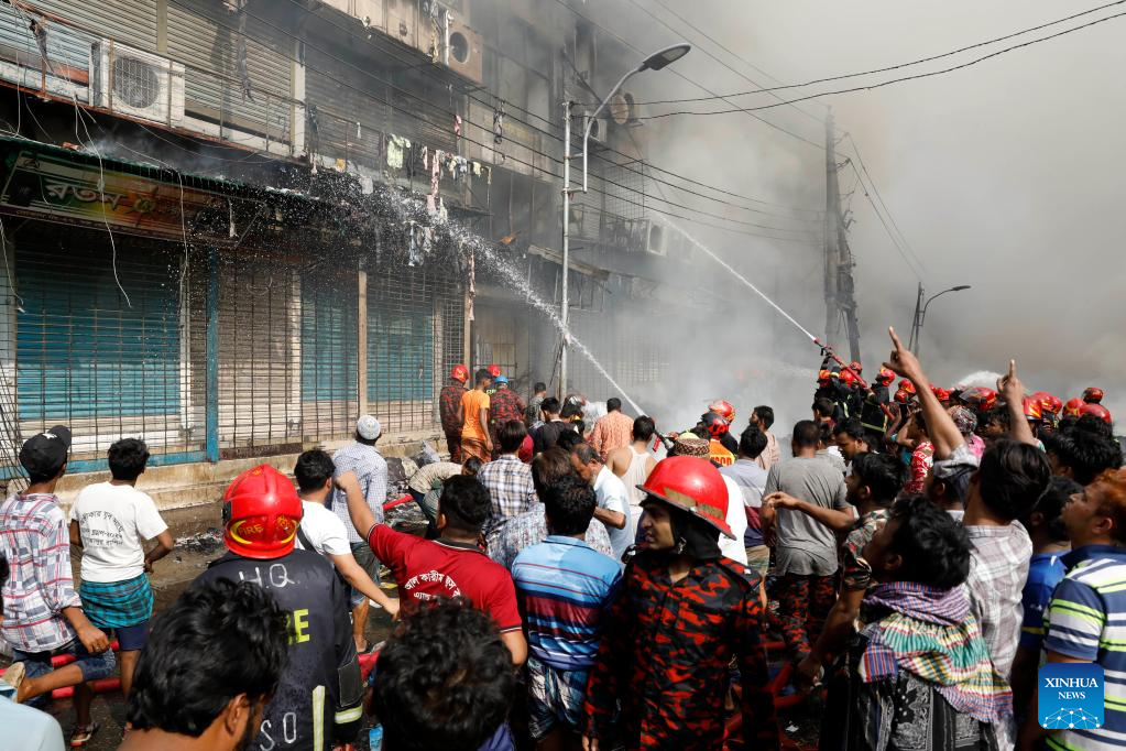 Local people help firefighters to spray water at the site where a fire broke out at a market in Dhaka, Bangladesh, on April 4, 2023. A fire gutted thousands of shops in a market in a residential neighborhood of the old part of Dhaka on Tuesday morning, destroying goods and property. (Xinhua)