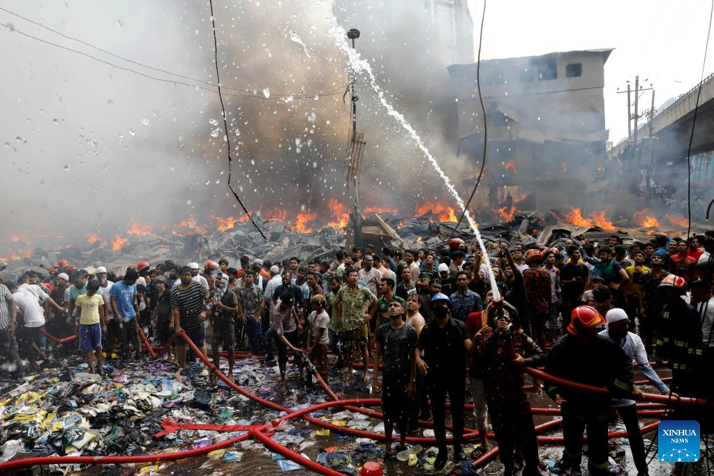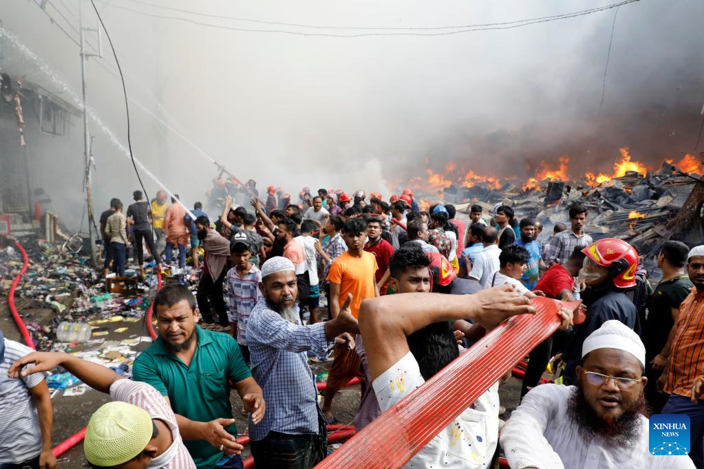Local people help firefighters to battle a fire at a market in Dhaka, Bangladesh, on April 4, 2023. A fire gutted thousands of shops in a market in a residential neighborhood of the old part of Dhaka on Tuesday morning, destroying goods and property. (Xinhua)