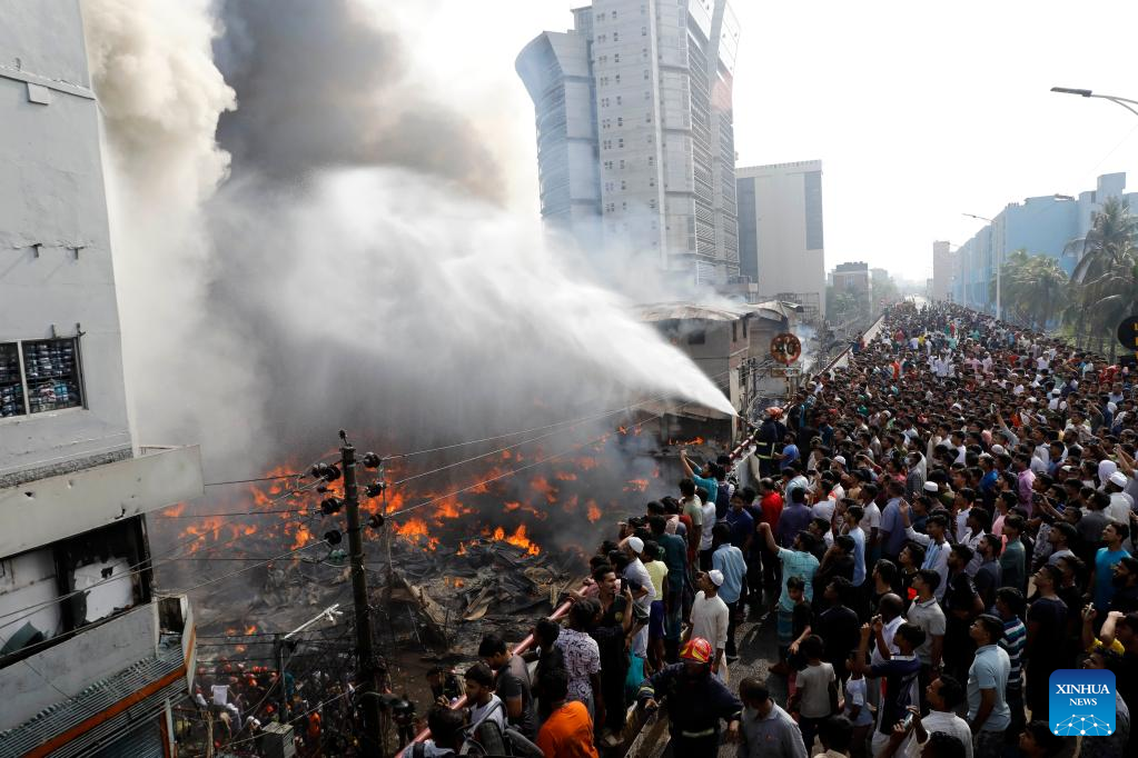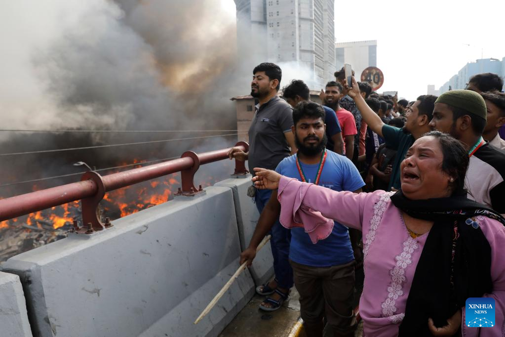 People gather at the site where a fire broke out at a market in Dhaka, Bangladesh, on April 4, 2023. A fire gutted thousands of shops in a market in a residential neighborhood of the old part of Dhaka on Tuesday morning, destroying goods and property. (Xinhua)