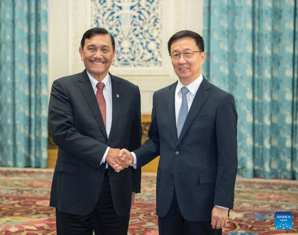 BEIJING, April 4 (Xinhua) -- Chinese Vice President Han Zheng on Tuesday met with Indonesia's Coordinator for Cooperation with China and Coordinating Minister of Maritime Affairs and Investment Luhut Binsar Pandjaitan.