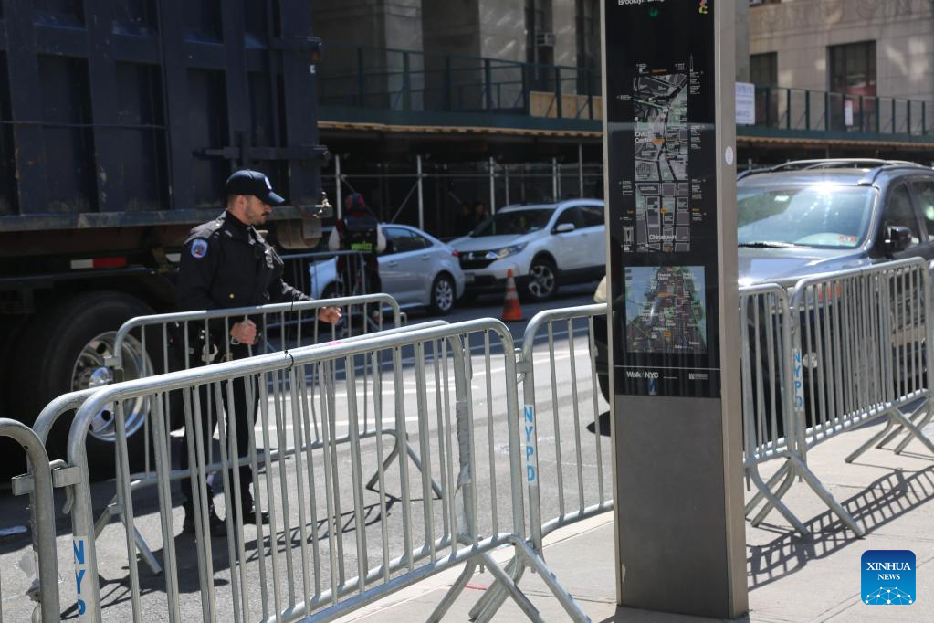 A law enforcement staff moves barricade outside the complex of Manhattan Criminal Court and Manhattan District Attorney's Office in New York, the United States, April 3, 2023. New York City further reinforced its security measures ahead of the scheduled arraignment of former U.S. President Donald Trump at a criminal court in Lower Manhattan on Tuesday. (Xinhua/Liu Yanan)