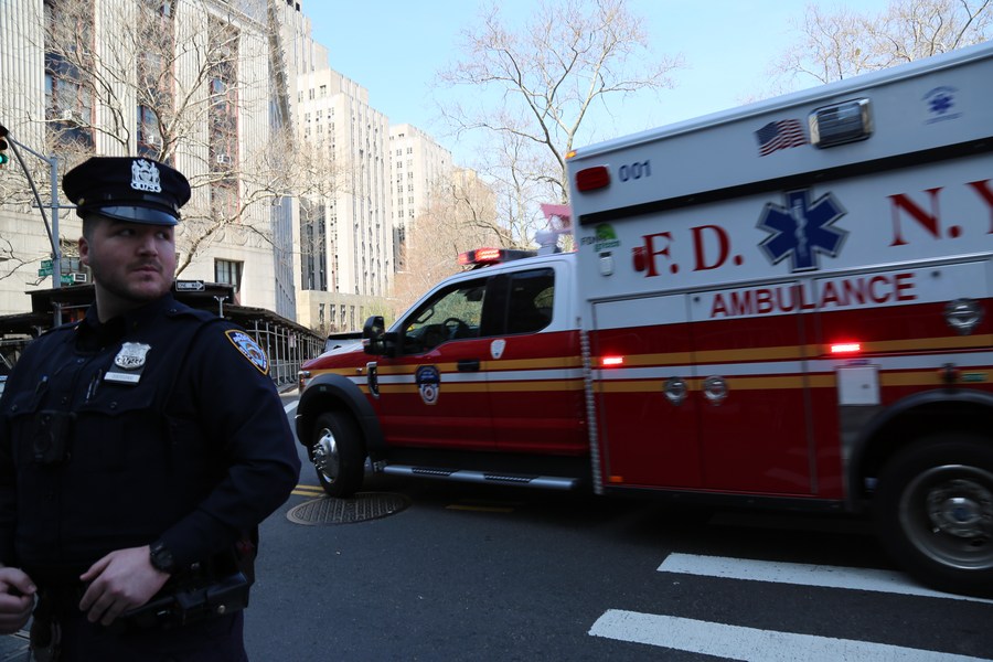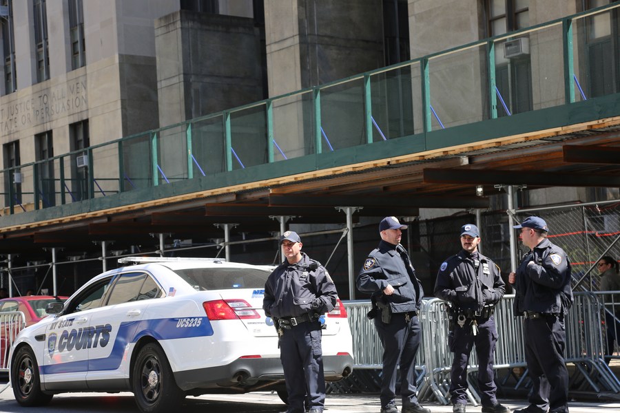 Law enforcement staff are on duty outside the complex of Manhattan Criminal Court and Manhattan District Attorney's Office in New York, the United States, April 3, 2023. (Xinhua/Liu Yanan)
