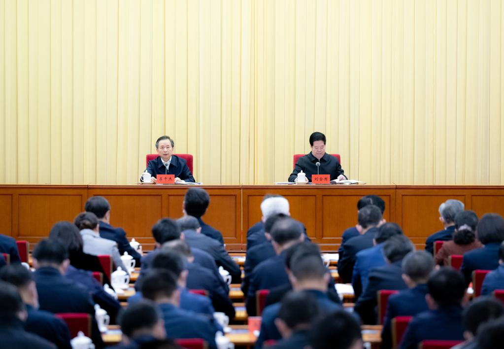 The guiding group of the Communist Party of China (CPC) Central Committee for the education campaign on the study and implementation of Xi Jinping Thought on Socialism with Chinese Characteristics for a New Era holds a training session in Beijing, capital of China, on April 4, 2023. Li Ganjie, a member of the Political Bureau of the CPC Central Committee and executive deputy chief of the central leading group of the campaign attended and delivered a speech at the session. Liu Jinguo, a member of the Secretariat of the CPC Central Committee and deputy chief of the central leading group of the campaign, presided over the session. (Xinhua/Zhai Jianlan)