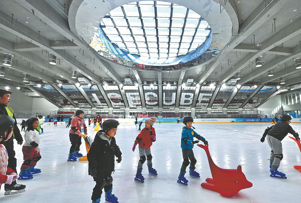 Visitors play ice sports at the National Aquatics Center in Beijing on Feb 4. The center, also known as the Water Cube or Ice Cube, served as a main venue for the 2022 Winter Olympics. WEI XIAOHAO/CHINA DAILY