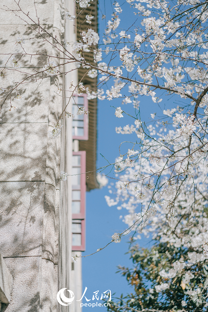 Photo taken on March 14, 2023 shows a gorgeous view of cherry blossoms in Wuhan University in Wuhan city, central China's Hubei Province. (People's Daily Online/Zhou Wen)