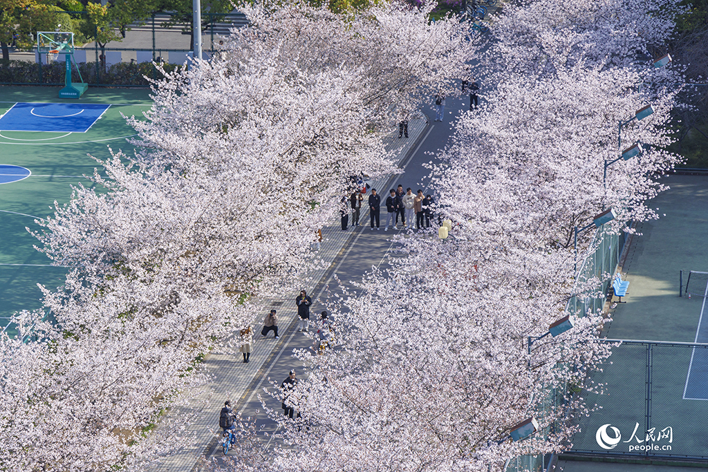 Blooming cherry blossoms become a delightful sight in the Siping Road Campus of Tongji University in east China's Shanghai, March 28, 2023. (People's Daily Online/Wang Chu)