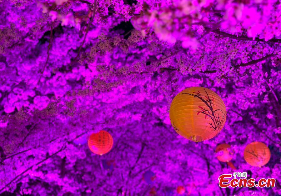 Cherry blossoms with colorful lights dazzle Yantai