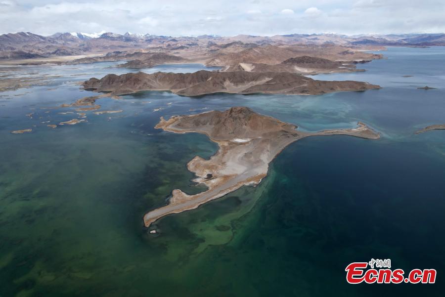 Aerial view shows the stunning scenery of Pangong Tso Lake at an average altitude of 4,242 meters in southwest China's Tibet Autonomous Region. (Photo: China News Service/Li Lin)