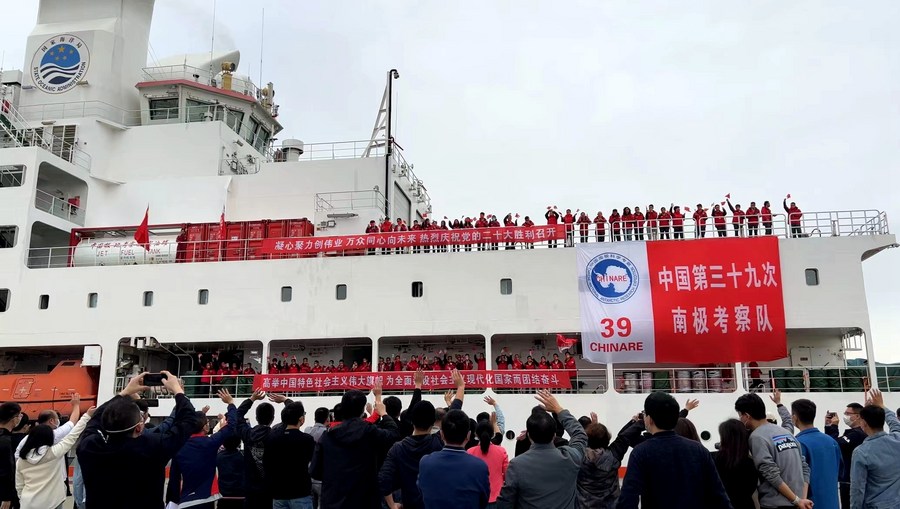 Chinese researchers wave goodbye as the research icebreaker Xuelong 2, or Snow Dragon 2, sets off for the country's 39th Antarctic expedition from Shanghai, east China, Oct. 26, 2022. (Polar Research Institute of China/Handout via Xinhua)
