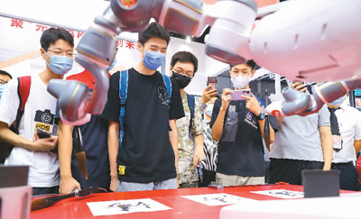 Visitors watch an artificial intelligence robot perform calligraphy at the 2022 World Artificial Intelligence Conference. (Xinhua/Fang Zhe)