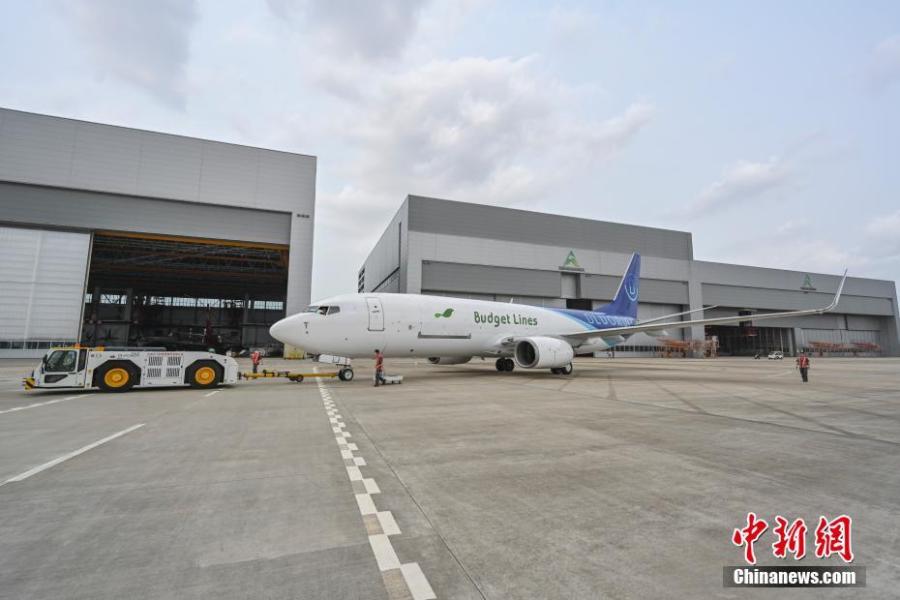 An inbound aircraft is transferred from the painting hangar to the maintenance hangar at the One-stop Aircraft Maintenance Industry Base of Hainan Free Trade Port in Haikou, south China's Hainan Province, April 6, 2023. (Photo: China News Service/Luo Yunfei)
