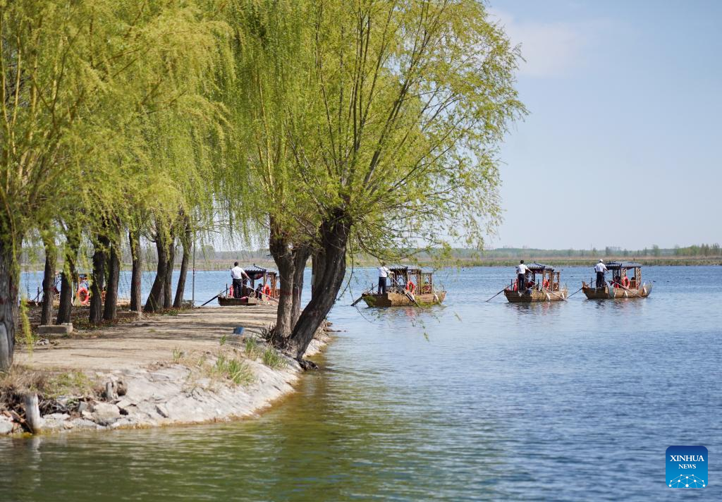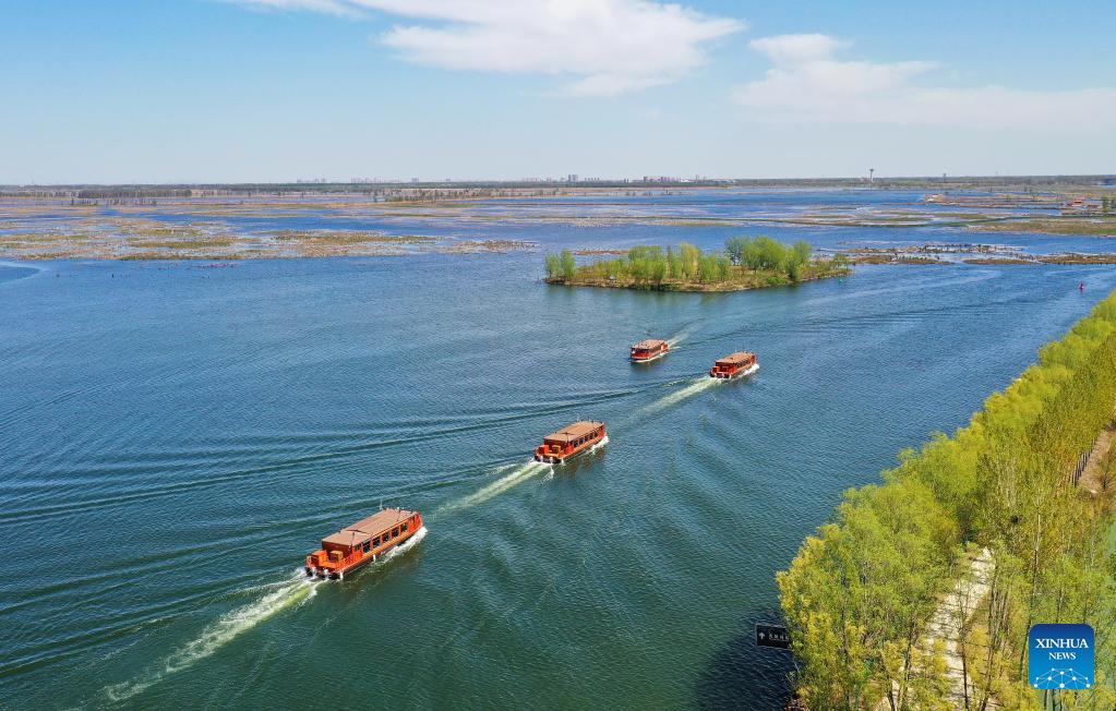 Tourist boats sail during the trial operation of the Baiyangdian Lake water bus service in Xiong'an New Area, north China's Hebei Province, April 7, 2023. The Baiyangdian Lake water bus service is currently in trial operation and will soon be officially launched. The service features 100 vessels powered by liquefied petroleum gas (LPG), which are more cost-efficient and environmentally friendly than oil-fueled boats. Visitors can also take traditional wooden boats which offer an alternative way of touring the Baiyangdian Lake. (Xinhua/Mu Yu)
