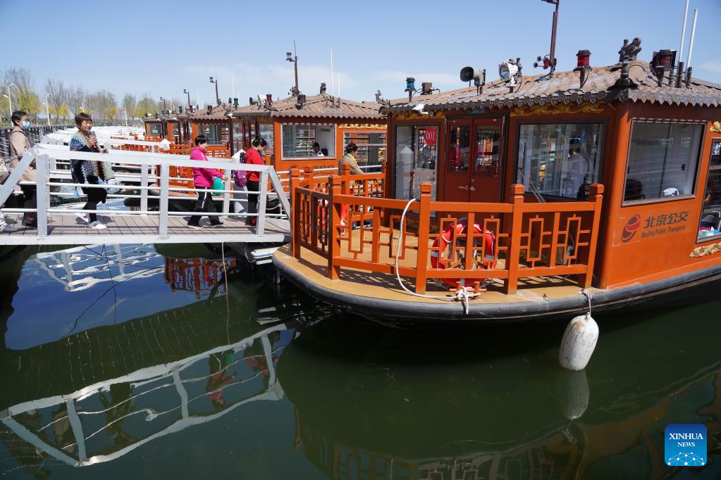 Tourists get on a vessel during the trial operation of the Baiyangdian Lake water bus service in Xiong'an New Area, north China's Hebei Province, April 7, 2023. The Baiyangdian Lake water bus service is currently in trial operation and will soon be officially launched. The service features 100 vessels powered by liquefied petroleum gas (LPG), which are more cost-efficient and environmentally friendly than oil-fueled boats. Visitors can also take traditional wooden boats which offer an alternative way of touring the Baiyangdian Lake. (Xinhua/Mu Yu)