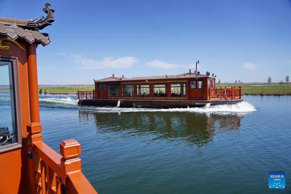 A vessel cruises during the trial operation of the Baiyangdian Lake water bus service in Xiong'an New Area, north China's Hebei Province, April 7, 2023. The Baiyangdian Lake water bus service is currently in trial operation and will soon be officially launched. The service features 100 vessels powered by liquefied petroleum gas (LPG), which are more cost-efficient and environmentally friendly than oil-fueled boats. Visitors can also take traditional wooden boats which offer an alternative way of touring the Baiyangdian Lake. (Xinhua/Mu Yu)