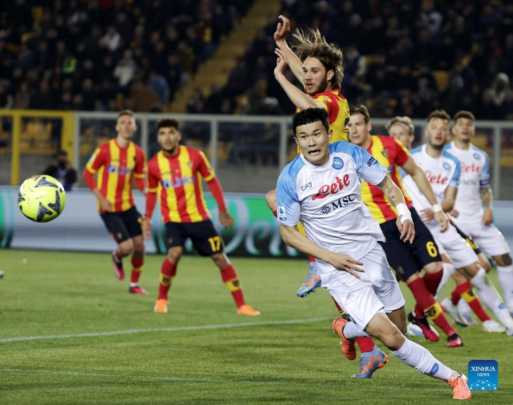 Napoli's Kim Min-Jae (front) vies with Lecce's Antonino Gallo during a Serie A football match between Napoli and Lecce in Lecce, Italy, on April 7, 2023. (Str/Xinhua)