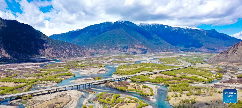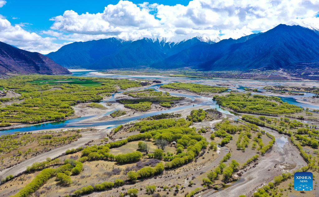 This aerial photo taken on April 7, 2023 shows the spring scenery at Yani national wetland park in Nyingchi, southwest China's Tibet Autonomous Region. (Xinhua/Nie Yi)
