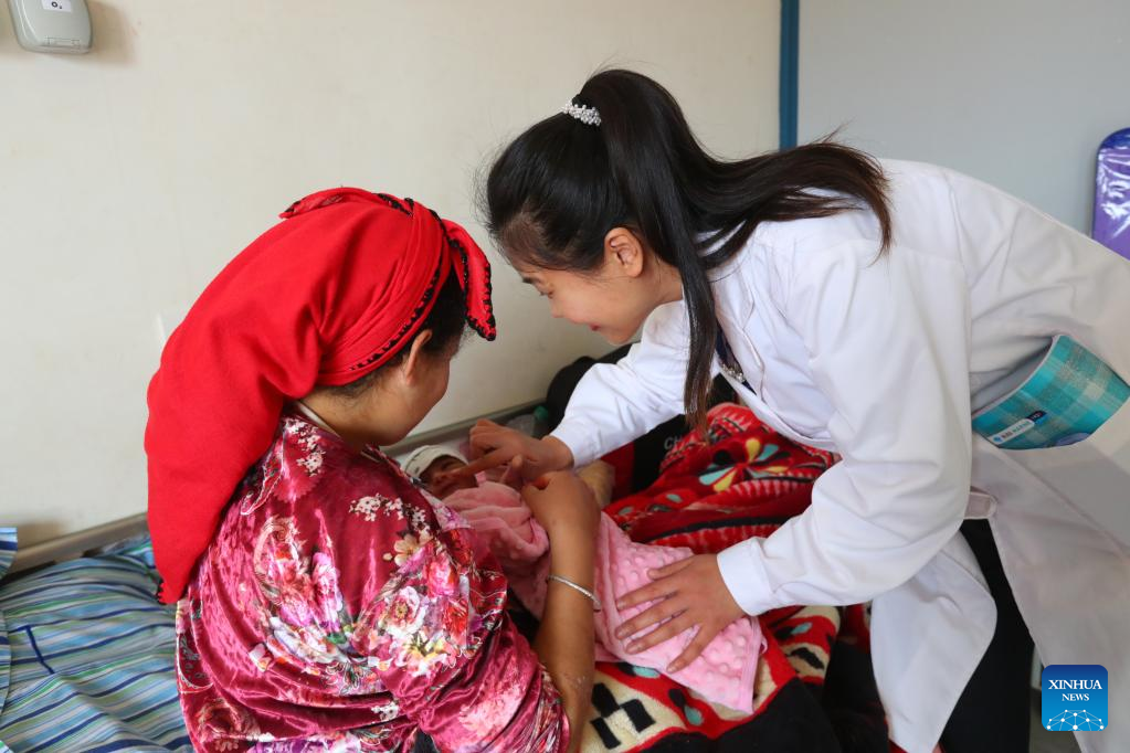 Chinese doctor Yin Hongli (R) checks a newborn at the Rhamna Provincial Central Hospital in Ben Guerir, Morocco, Feb. 26, 2023. "I'm a living example among the thousands of cases saved by Chinese doctors in Morocco," Rachidi Imane, a Moroccan doctor, recalled how she was saved upon birth by a Chinese doctor 42 years ago. (Xinhua/Sui Xiankai)