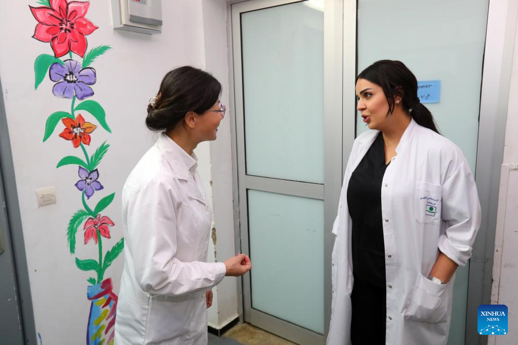 Chinese doctor Zhang Qian speaks with a Moroccan doctor at the Rhamna Provincial Central Hospital in Ben Guerir, Morocco, Feb. 26, 2023. "I'm a living example among the thousands of cases saved by Chinese doctors in Morocco," Rachidi Imane, a Moroccan doctor, recalled how she was saved upon birth by a Chinese doctor 42 years ago. (Xinhua/Sui Xiankai)